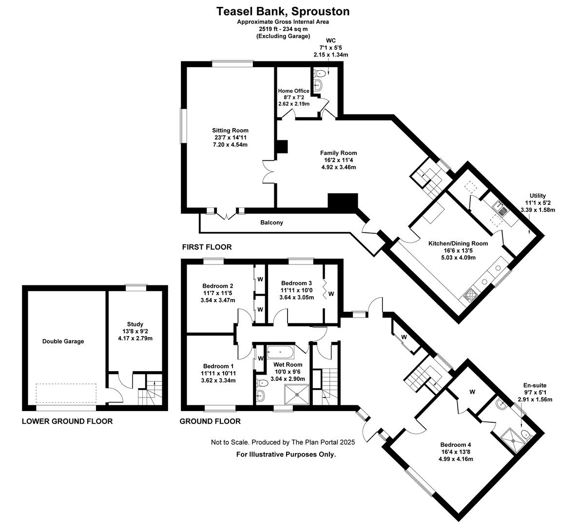 First Floor: Family Room/Lounge (Log burner) with access to balcony, Sitting Room with Access to balcony, Dining Kitchen, Utility Room, Larder, WC and Office