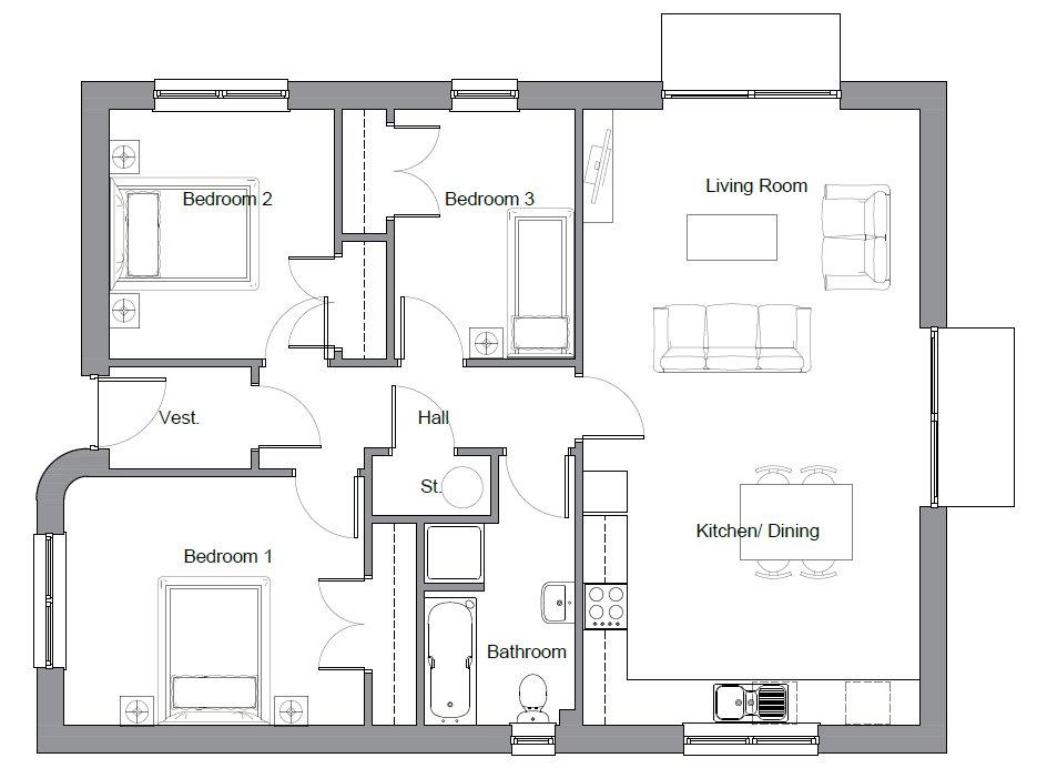 Pre-finished Linear style timber doors (glazed doors to Vestibule & Kitchen/ Living Room) finished in white, door surrounds and skirting to be painted white. Decoration to ceilings to be white with walls in each room to be as per the buyers choice.